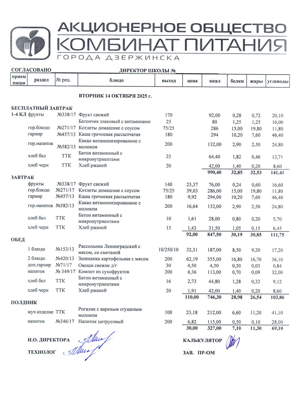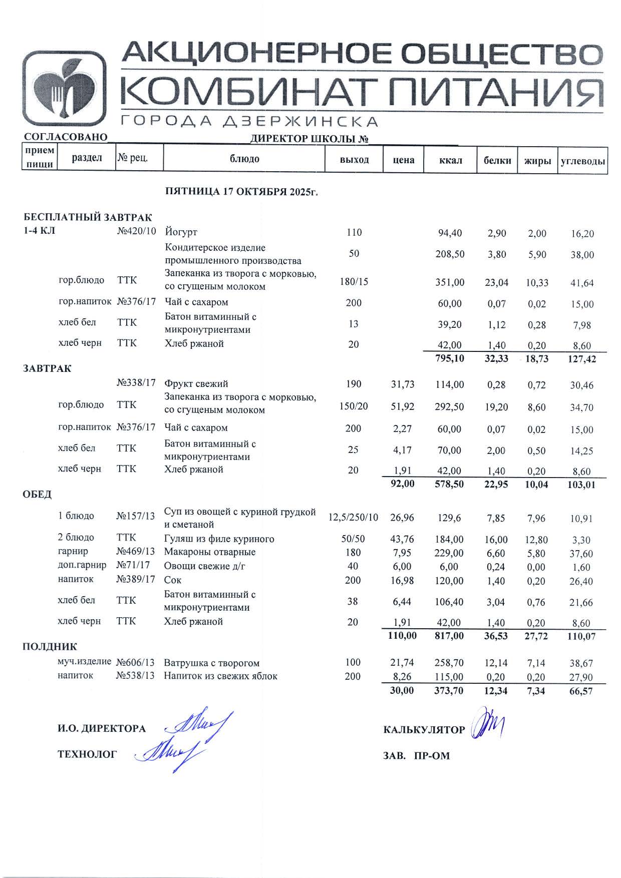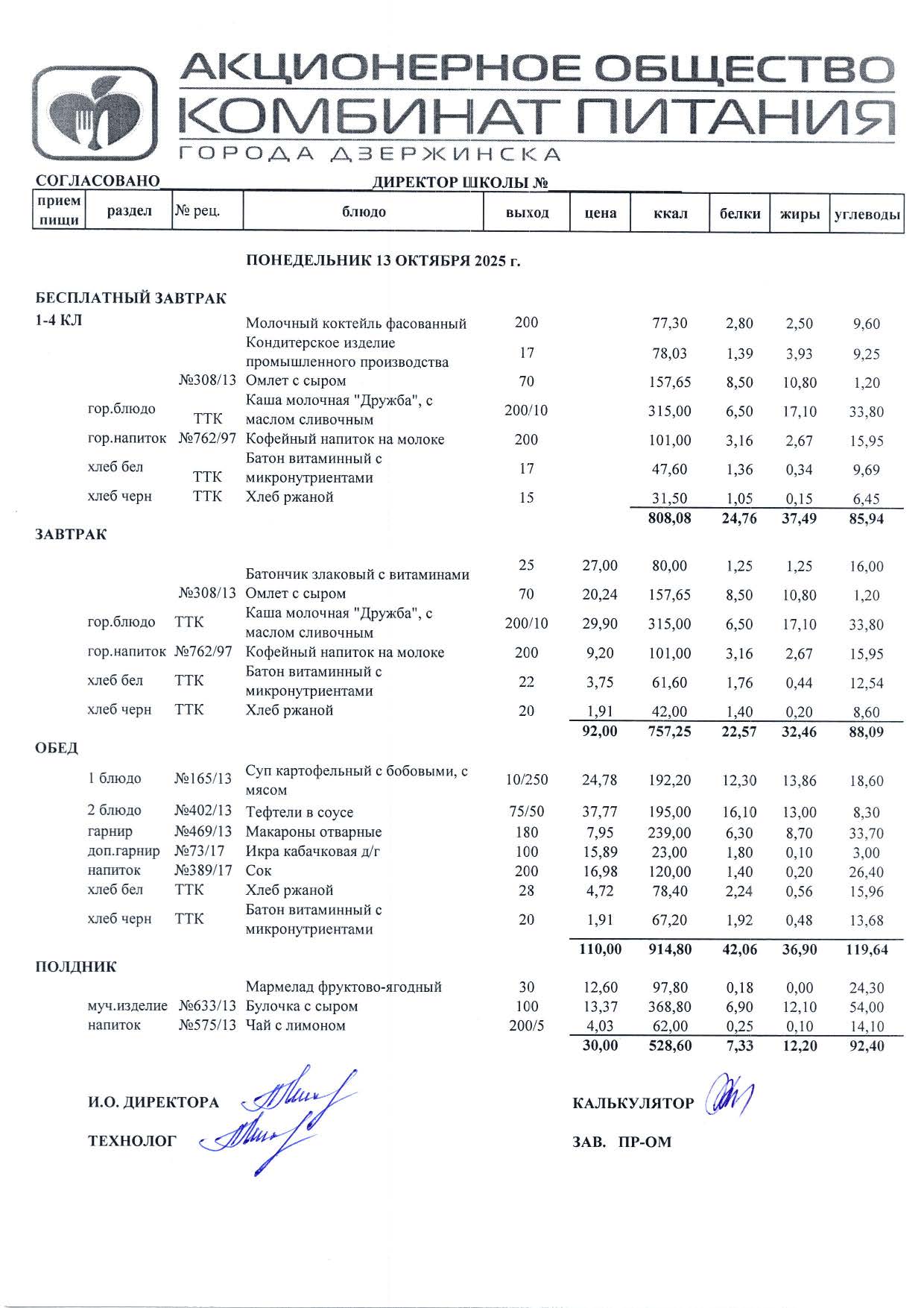 Школьное меню Цикличное 10 дневное меню 1-4 класс Цикличное 10 дневное меню 1-4 класс с ОВЗ Цикличное 10 дневное меню 5-11 класс Цикличное 10 дневное меню 5-11 класс с ОВЗ Меню с 13.10.2025 по 17.10.2025 посмотреть/скачать.