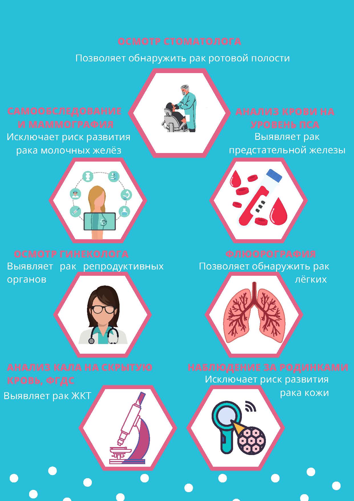 Диспансеризация включает в себя регулярные осмотры и обследования, которые помогают своевременно выявлять заболевания. Это особенно актуально для онкологических заболеваний, где раннее выявление может существенно повысить шансы на выздоровление. Диспансеризация предусматривает проведение онкоскринингов по восьми наиболее распространенным локализациям новообразований: шейки матки, молочной железы, простаты, кишки, желудка, кожи, лёгких, полости рта.